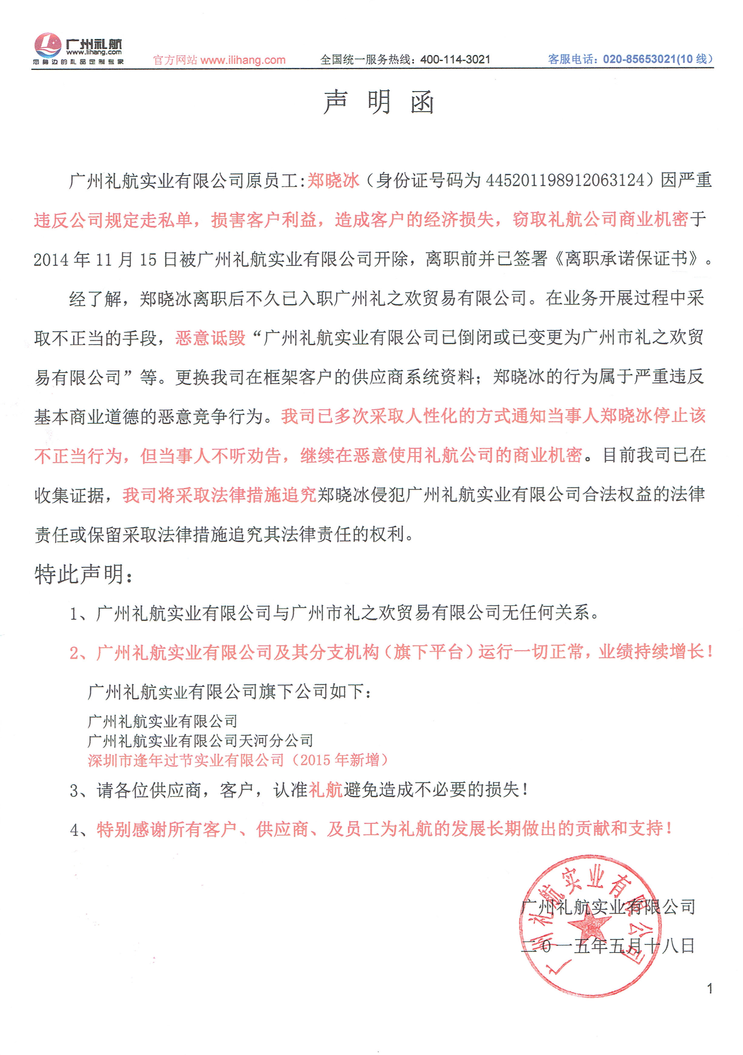 【公告】礼航声明函