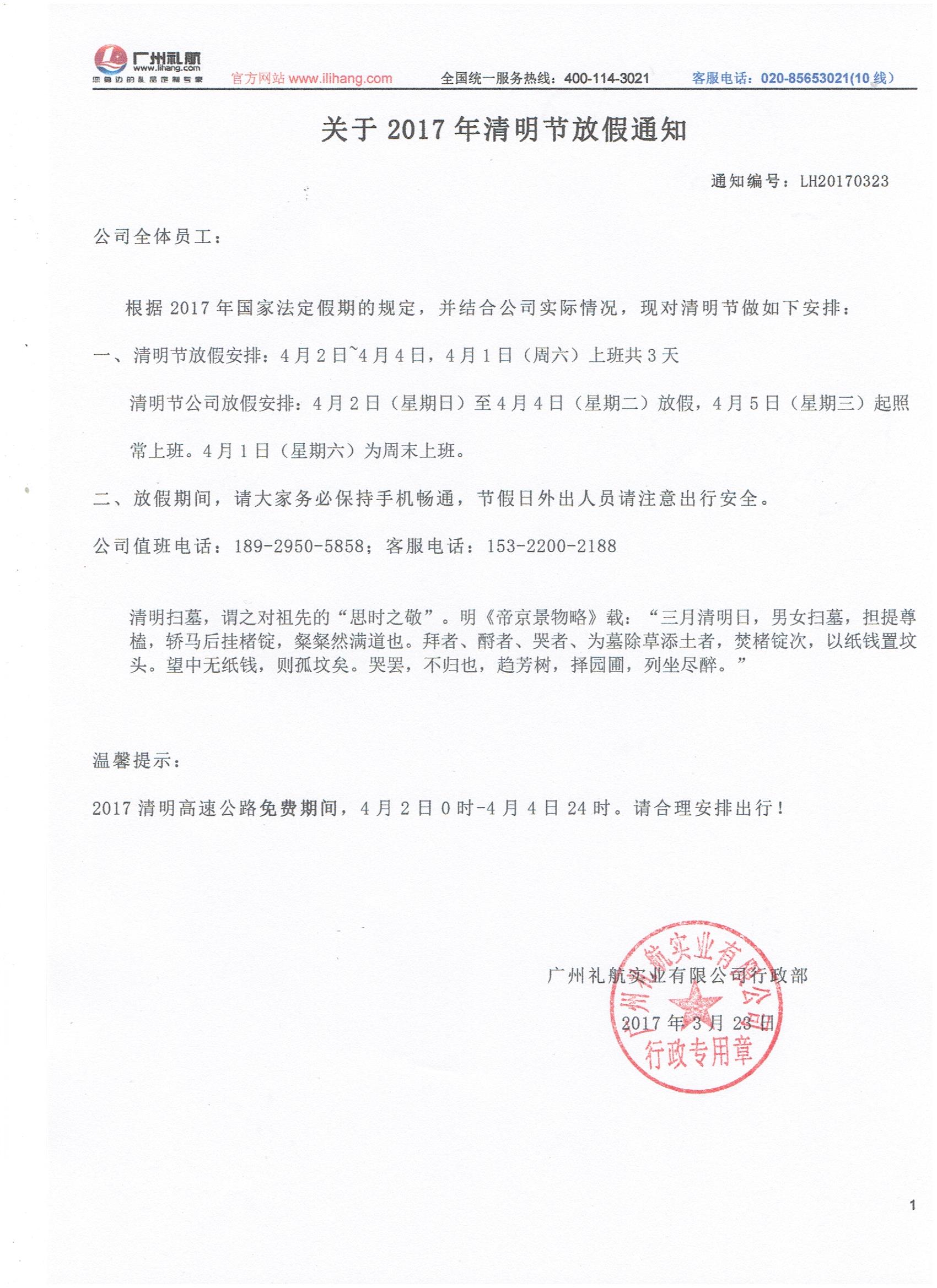 【公告】2017清明节放假通知