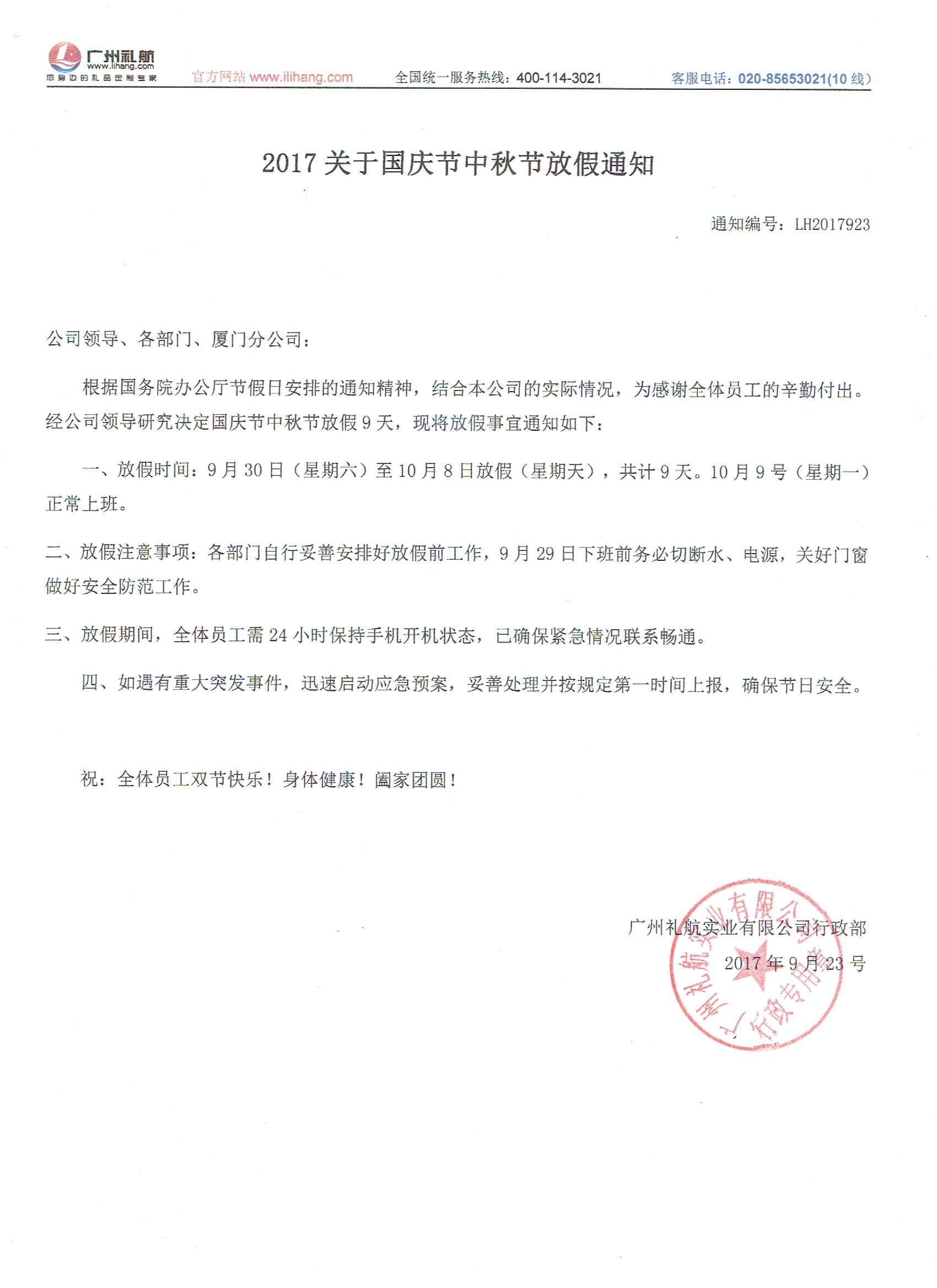 【放假通知】2017关于国庆节中秋节放假通知