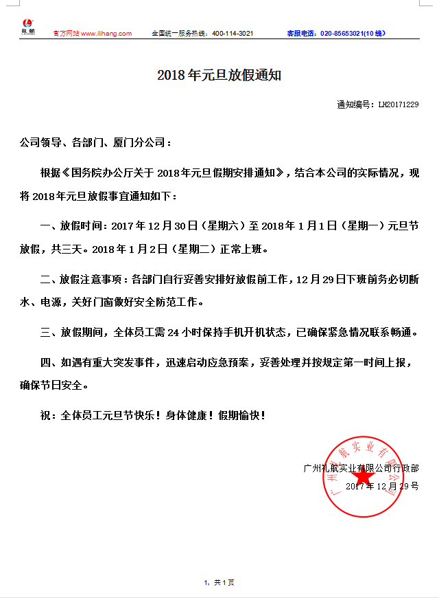 【通知】2018年元旦放假通知