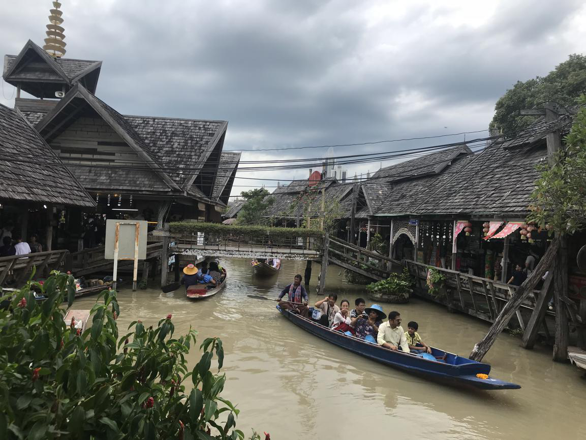 紧接着下午我们去参观了杜拉拉四合镇水乡,《杜拉拉升职记》的拍摄地,融合了浓郁纯朴的泰国乡村文化气息,一幢幢古色古香的木雕风格泰式房屋围建于迂回的河道上而形成风情独特的水上人家。舢板船随着船夫划桨撩拨起水波蜇游穿梭前行,偶见传统民俗舞蹈笙歌。美哉也。
