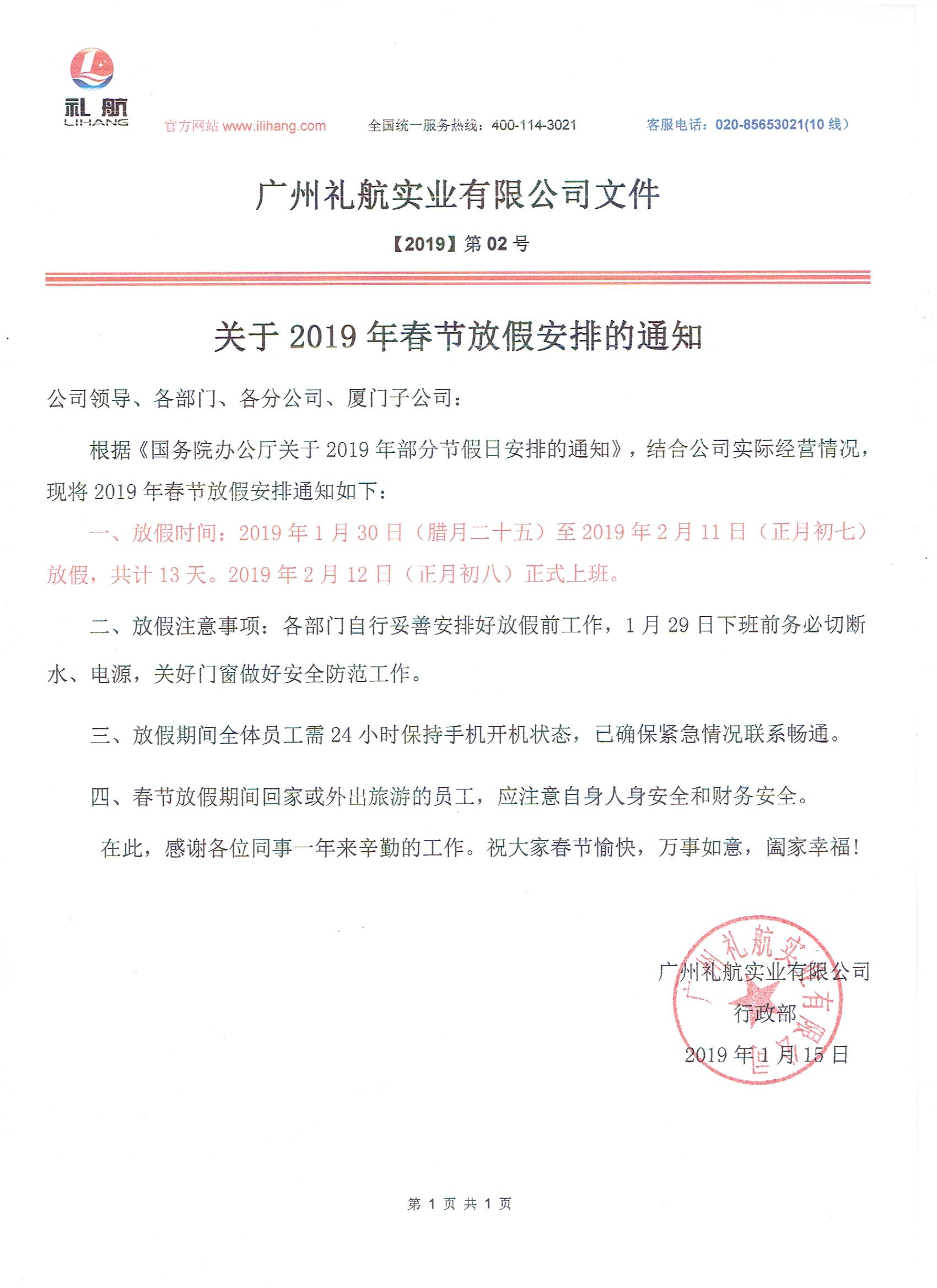 根据《国务院办公厅关于2019年部分节假日安排的通知》,结合公司实际经营情况,现将2019年春节放假安排通知如下: