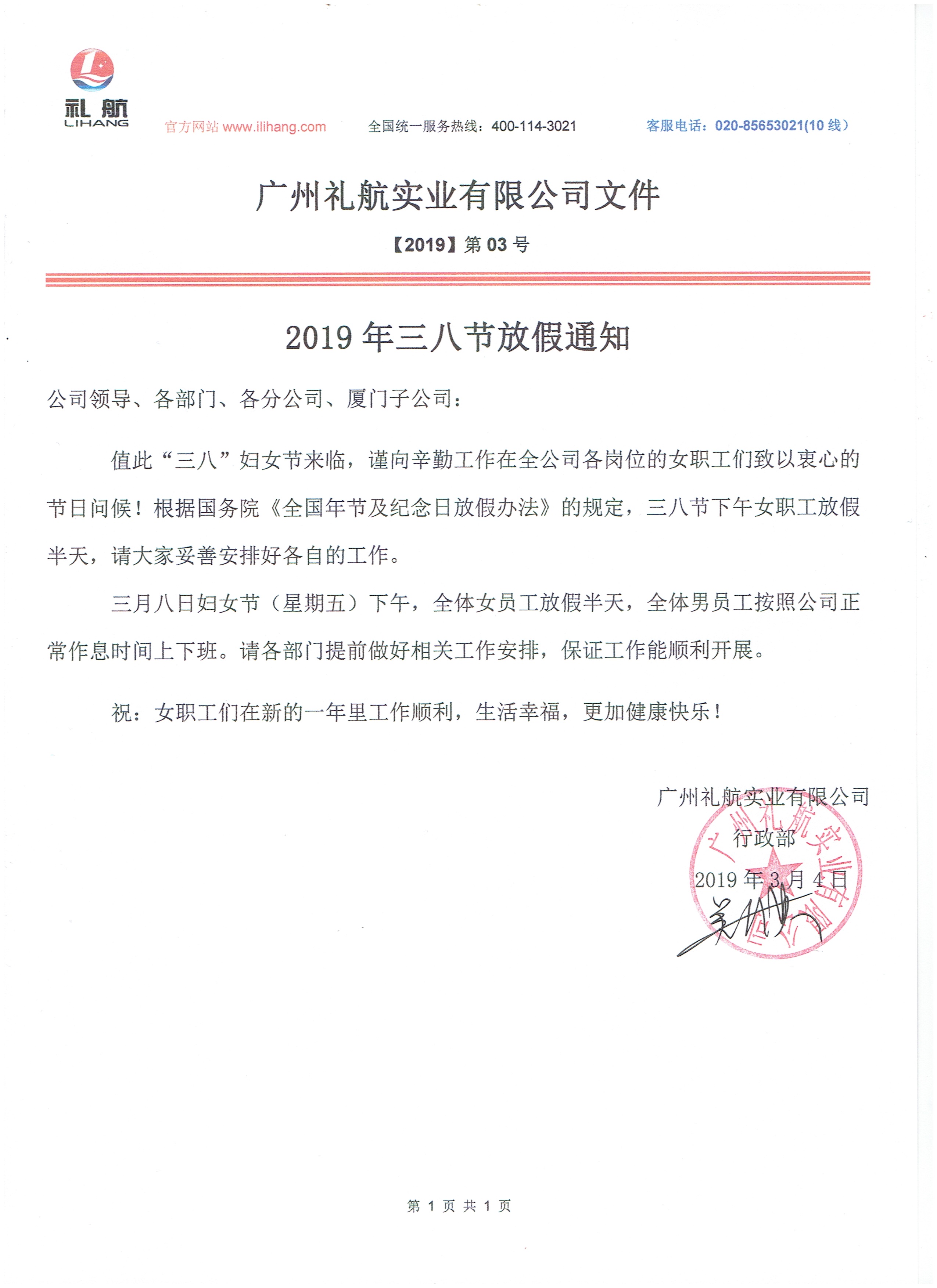 2019年三八节放假通知
