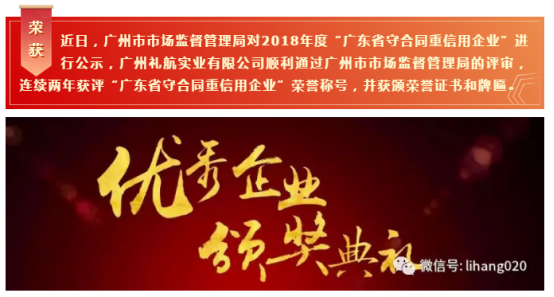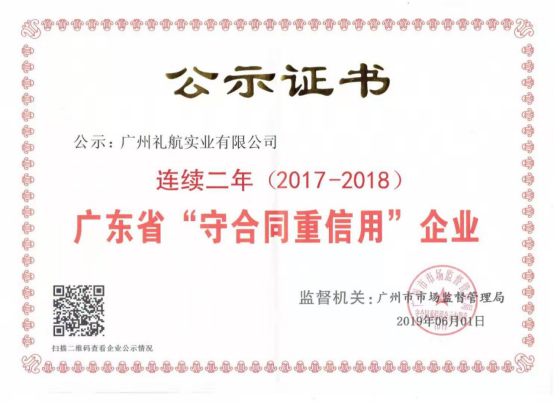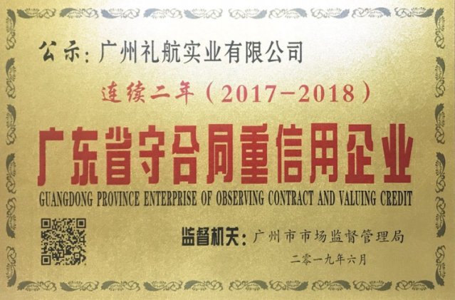 恭喜礼航连续两年荣获“广东省守合同重信用企业”