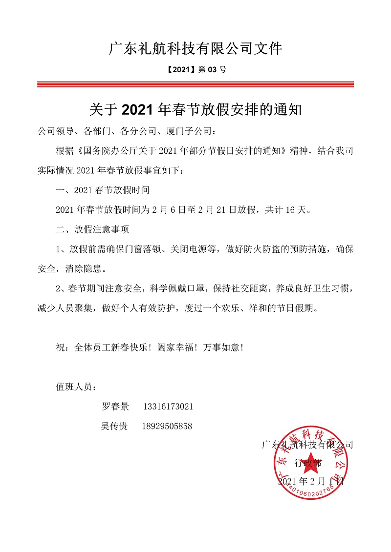 根据《国务院办公厅关于2021年部分节假日安排的通知》精神,结合我司实际情况2021年春节放假事宜如下: