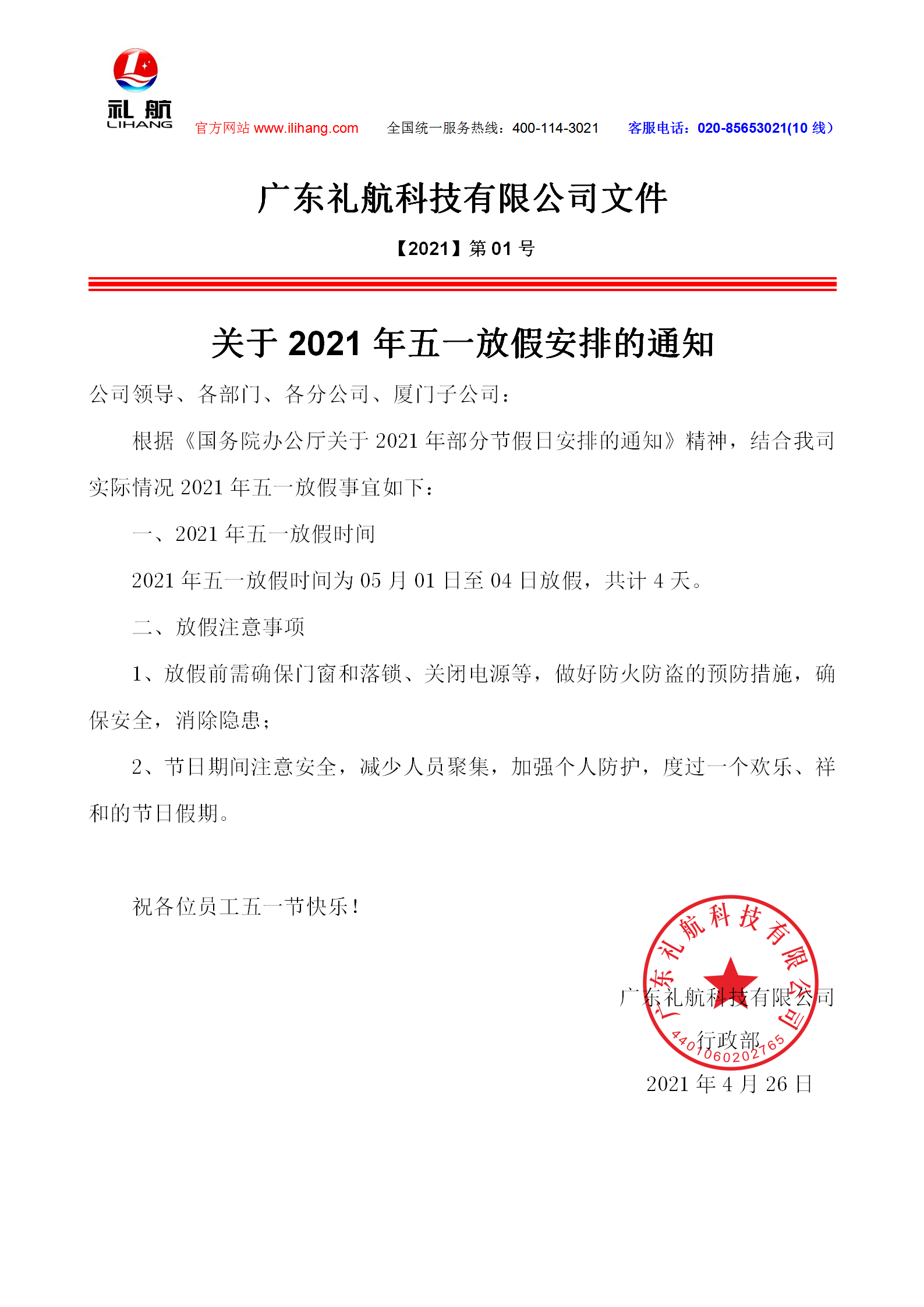 根据《国务院办公厅关于2021年部分节假日安排的通知》精神,结合我司实际情况2021年五一放假事宜如下: