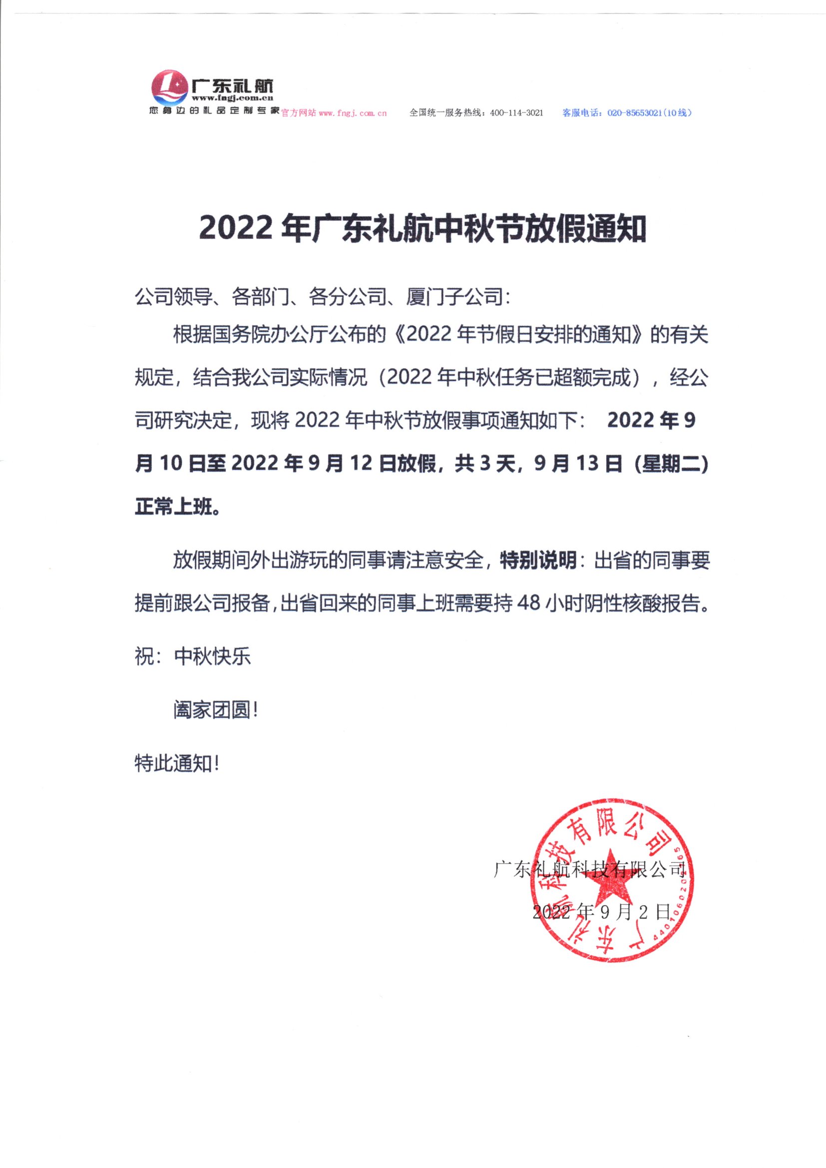 【放假通知】2022年广东礼航中秋节放假通知