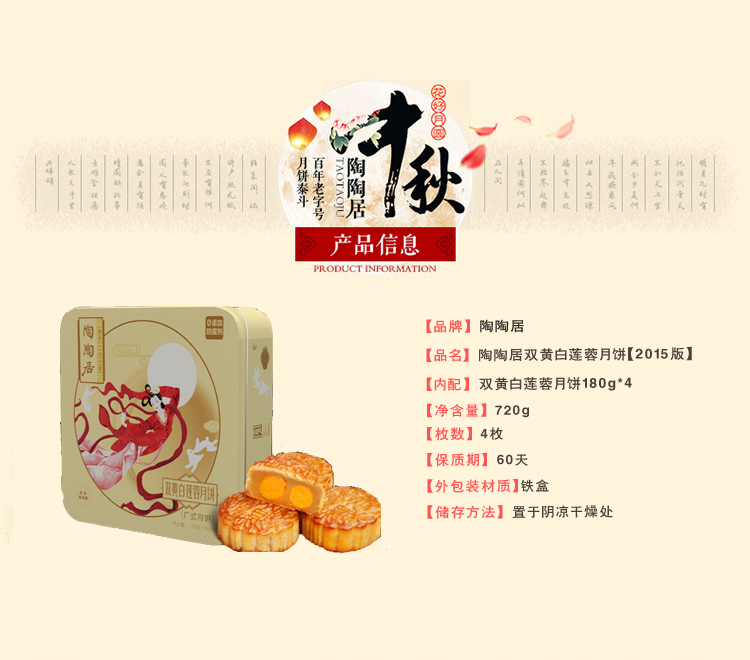 产品名称:陶陶居双黄白莲蓉月饼720g【2015版】