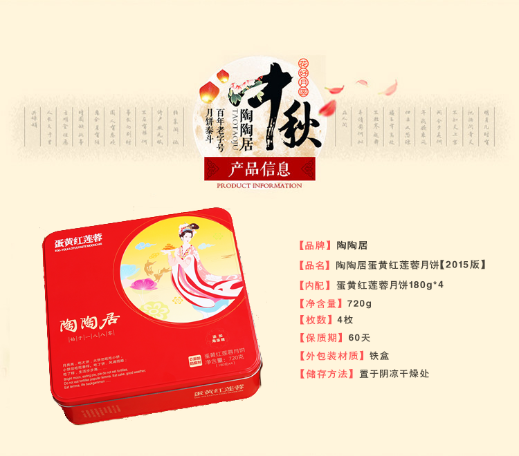 产品名称:陶陶居蛋黄红莲蓉月饼720g【2015版】