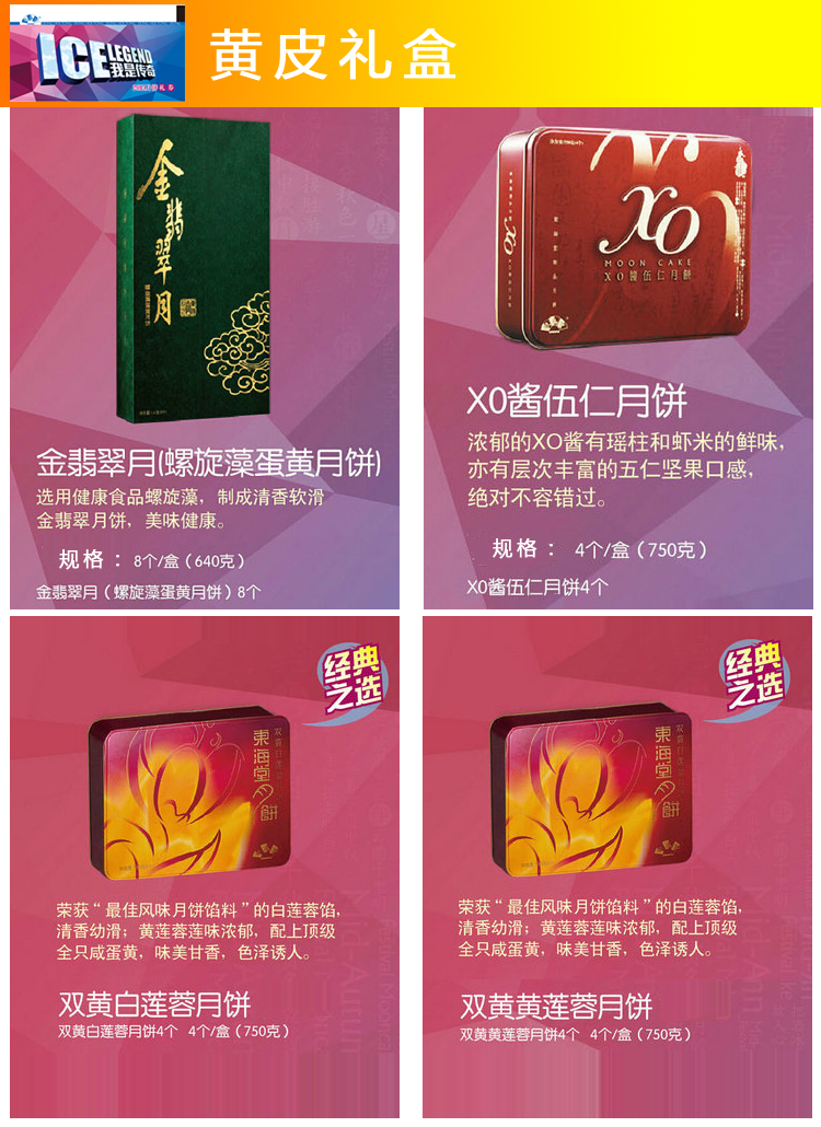油皮礼盒:金翡翠月(螺旋藻蛋黄月饼)、双黄白莲蓉月饼、双黄黄莲蓉月饼、X0酱伍仁月饼