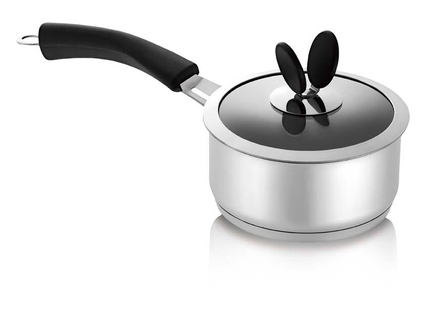 锅具手柄为航空器操纵杆形状,用很小力气就能提起锅子。手柄与锅身的间距科学设定,避免热辐射烫手,